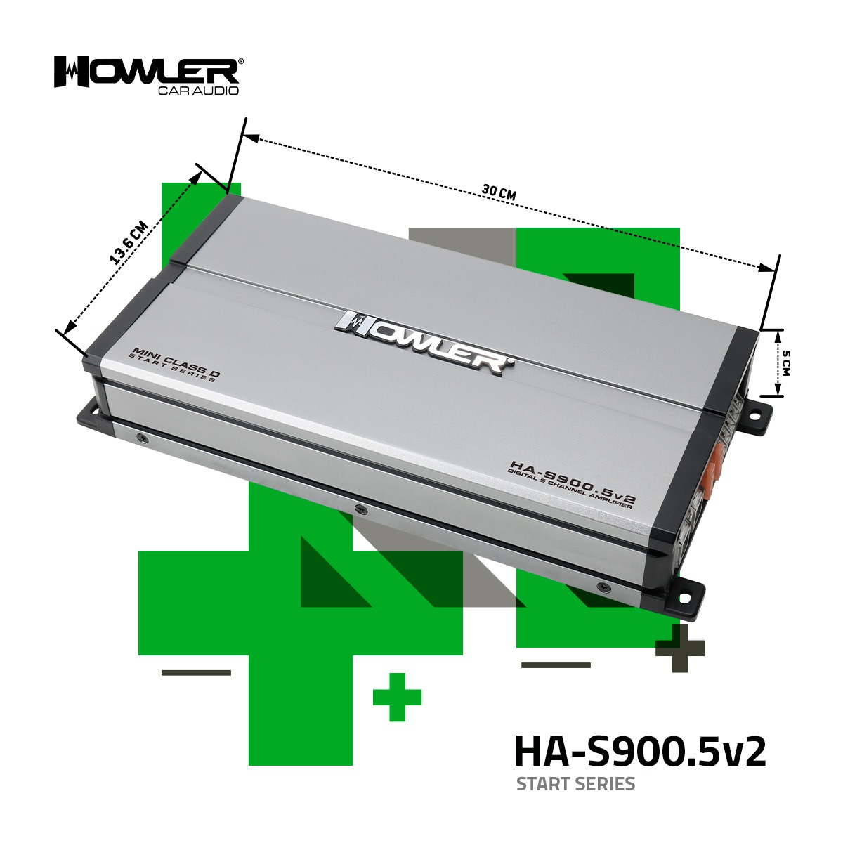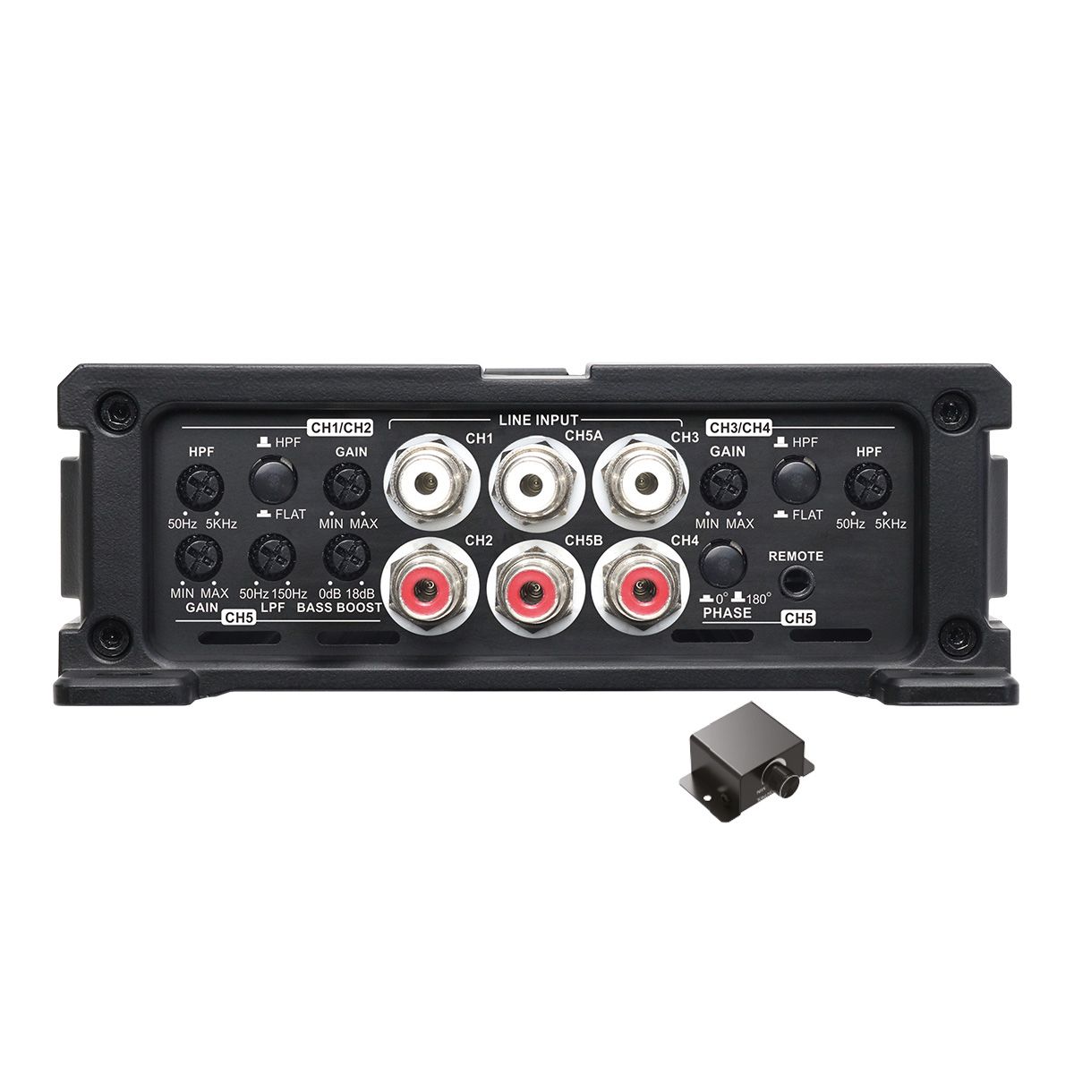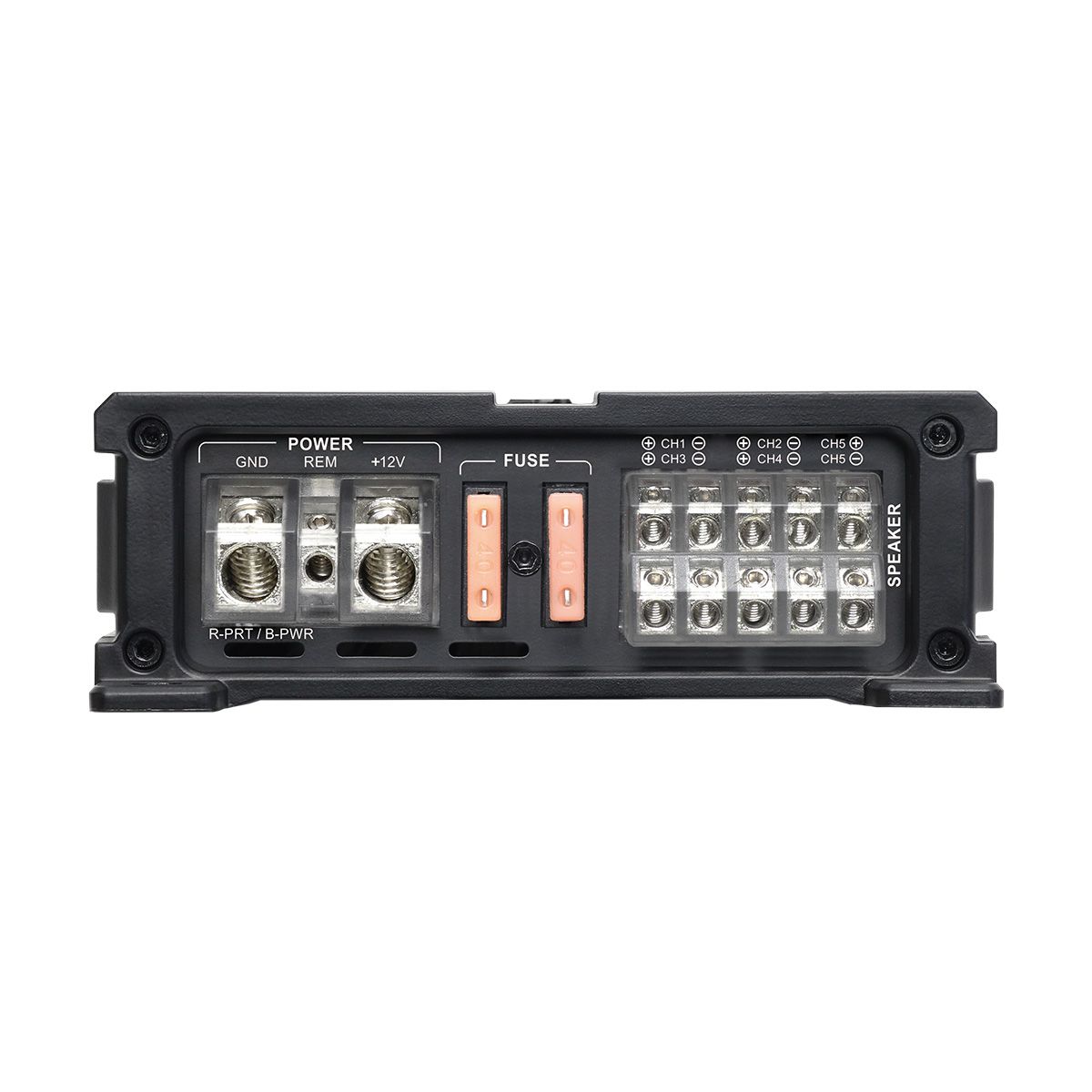 “Amplificador de 5 canales, DC 12V, diseñado para configuraciones en modo cuadrafónico o en modo puente. Ideal para montar un sistema completo en tu automóvil, proporcionando 4 canales para las bocinas y un quinto canal dedicado al subwoofer, ofreciendo potencia y calidad en cada componente.”