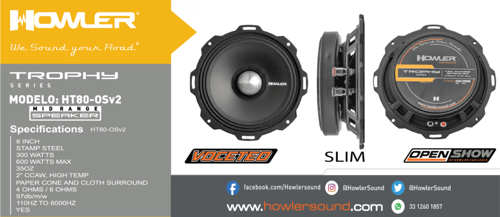 Impedancia de 8 Ohms. Cuenta con un potente rango medio en un tamaño de profundidad slim, diseñado para ofrecer un sonido fuerte, claro y contundente. Sus frecuencias están optimizadas para una reproducción sonora de alta calidad, ideal para sistemas de audio que requieren presencia y definición en el rango medio.