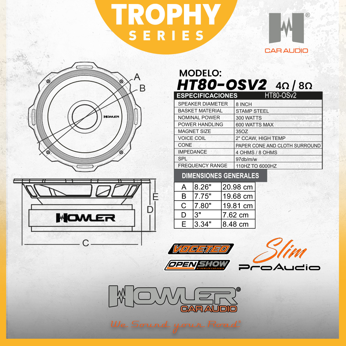 Impedancia de 4 Ohms. Cuenta con un potente rango medio en un tamaño de profundidad slim, diseñado para ofrecer un sonido fuerte, claro y contundente. Sus frecuencias están optimizadas para una reproducción sonora de alta calidad, ideal para sistemas de audio que requieren presencia y definición en el rango medio.