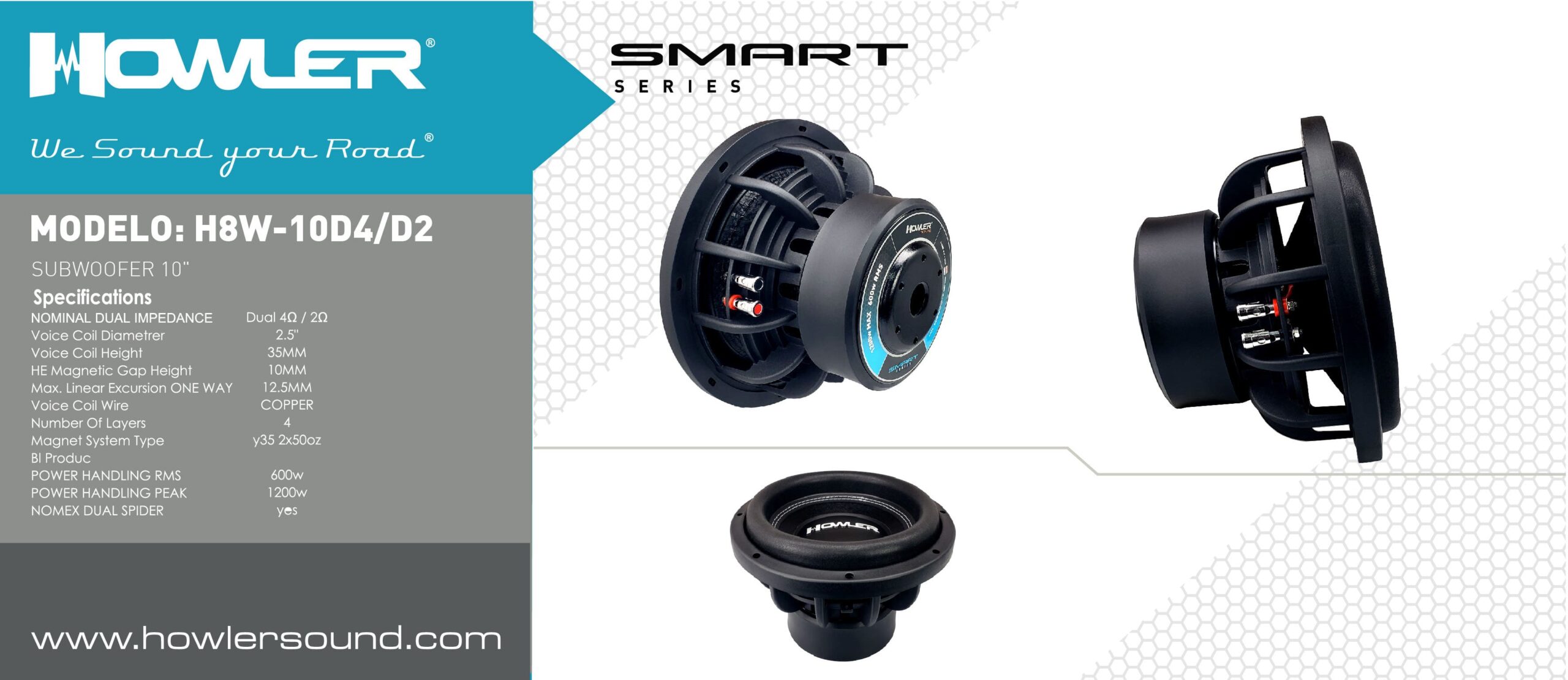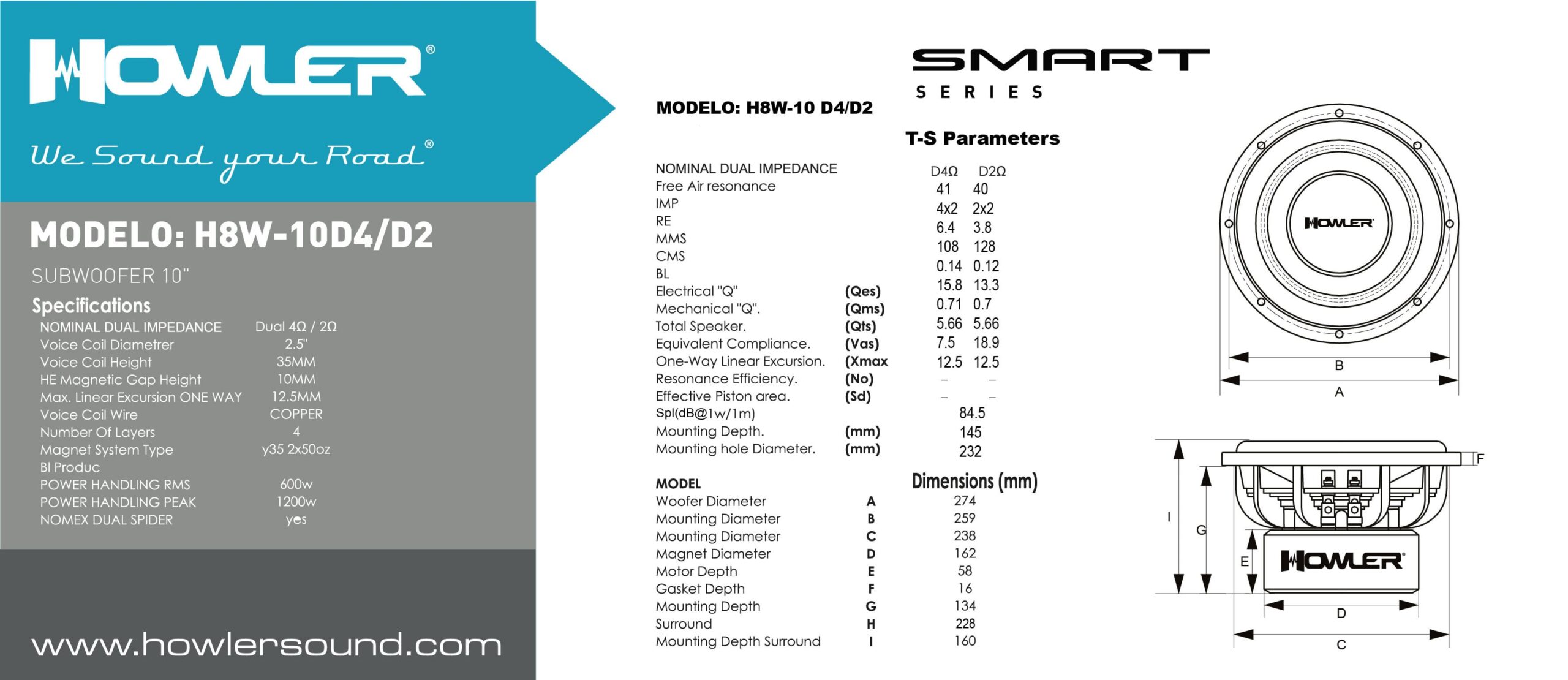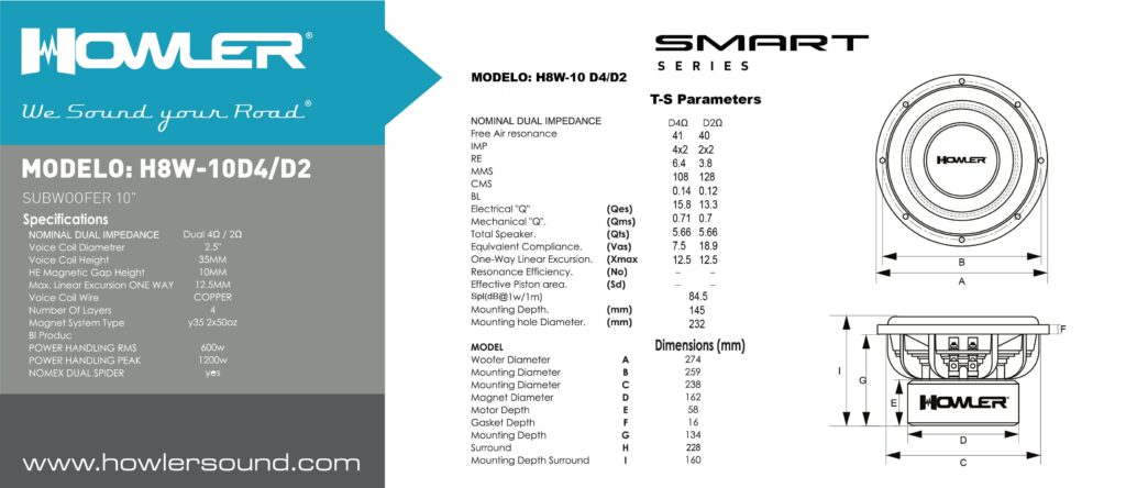 SUBWOOFER 10″ BOBINA 2.5″- Impedancia Nominal D4Ω- 1200w Max 600w Rms